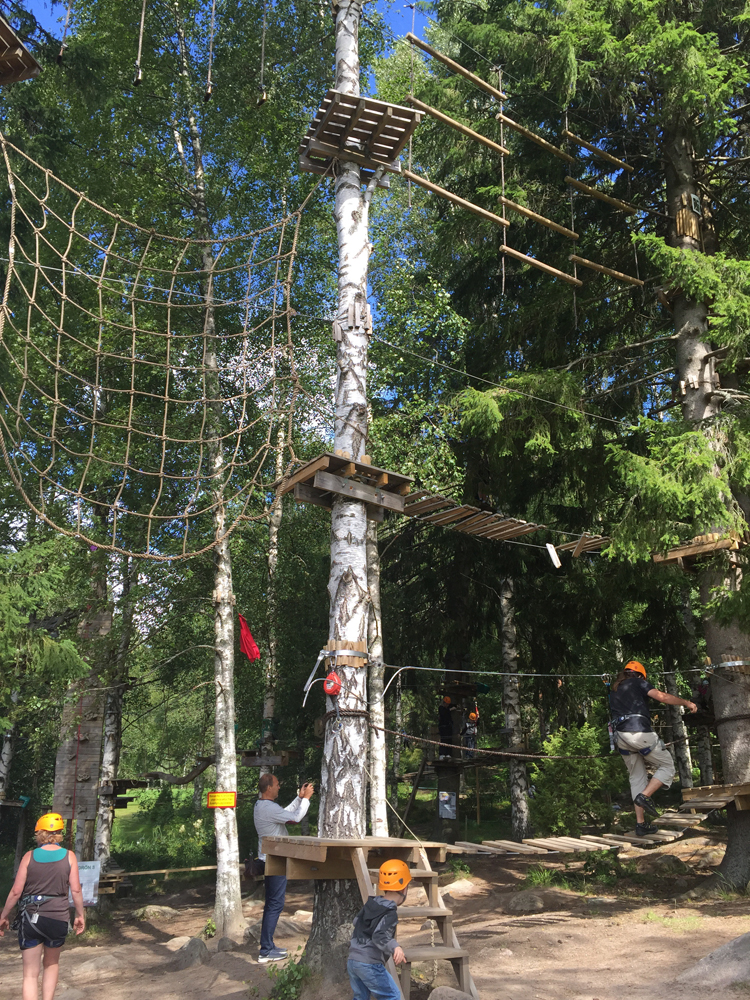 Once my bag came, I quickly unpacked and put away all my clothes, and then packed another bag for our little trip to Farmor’s, which is Swedish for dads mom, in Trollhättan. Our first stop along the way was to a zip lining and ropes course somewhere in the woods of Sweden. We turned off the highway, drove a few minutes past some gorgeous scenery, and we were there. They had many different levels of courses all corresponding to a certain color and one giant zip line across a lake at the end.