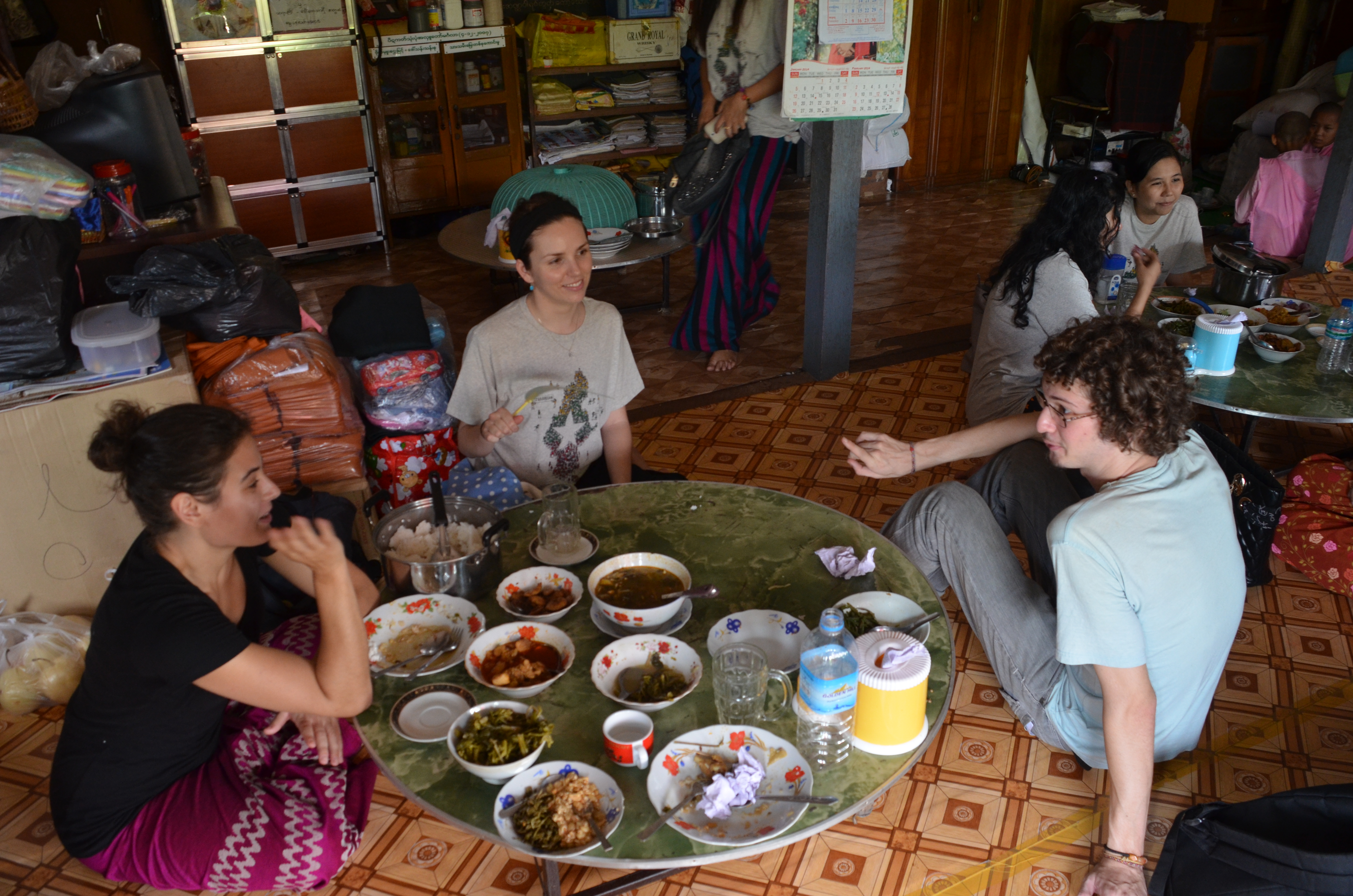 becca and lucy with students at monastery schoolstudents at monastery schoollucy teachingbecca, lucy and george eating lunchNELC Xplore employee emon with buddhist novice nuns novice monks and a villager that study at the monastery school