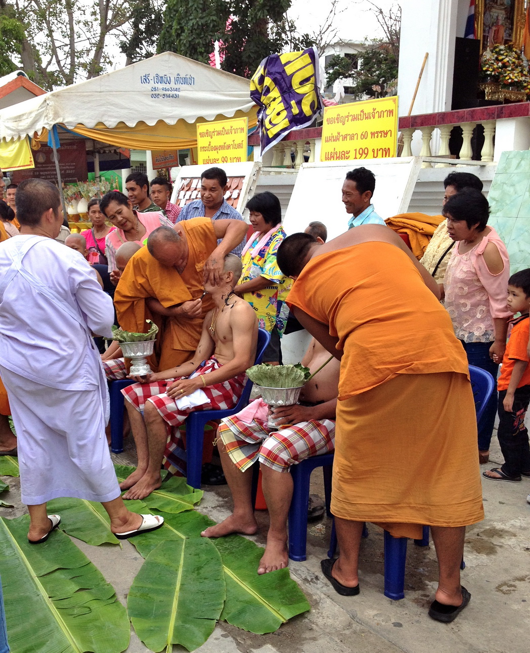 er the tent kept turning around and smiling at us while we watched from the side, and once there was a pause in the music we decided to go over and ask what was going on. There were 5 women, an older man, and a few children. Two of the women spoke English, one of them better than the other. We practiced our Thai with the women by saying hello and asking how they were in Thai, and they seemed to enjoy our efforts. We inquired about the ceremony, which is how our assumptions about monkhood were met. One of the women was older, I assumed she was the matriarch of the family, and we were told by one of the English speakers that someone from her family was up in the ceremony. They were really friendly and kept encouraging us to take pictures. After about the third time they motioned for us to take some, we got closer – right up in front of the future-monks – and documented our experience through film. By this point, the families were finished cutting hair with scissors and the monks began to wash the heads of the young neophytes. They then proceeded to shave their heads with a straight razor, and took off all of the hair from their scalp and face – including their eyebrows. It was at this point that the 20 year old men began to look like monks.